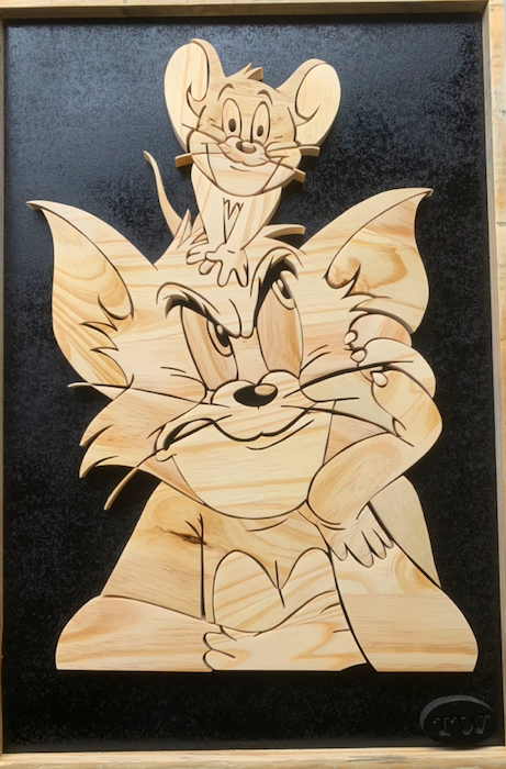 Retrouvez l’énergie et l’humour légendaire du duo le plus iconique du cartoon avec cette création en bois entièrement artisanale. Ce tableau met en scène Tom et Jerry dans une composition capturant parfaitement leur esprit malicieux et leur rivalité eternelle.